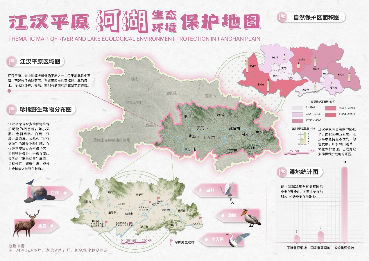 《江汉平原河湖生态环境保护地图》作为主图,总体介绍了江汉平原的基本情况,包括三幅子图和一幅柱状图,涵盖地理位置、珍稀动物、自然保护区和湿地等内容。其中《江汉平原区域图》展示了湖北省的地形地貌,江汉平原范围高亮突出表示,从图中可以看出江汉平原位于湖北省中南部,是中国海拔最低的平原之一。《自然保护区图》和《湿地统计图》利用分级统计图表法和统计图表的方式展示自然保护区和湿地保护现状。《珍稀野生动物分布图》展示小天鹅、卷羽鹈鹕、白鹤、江豚、麋鹿等珍稀动物的分布状况。国家级保护动物江豚和麋鹿均在江汉平原建立自然保护区实施保护。
