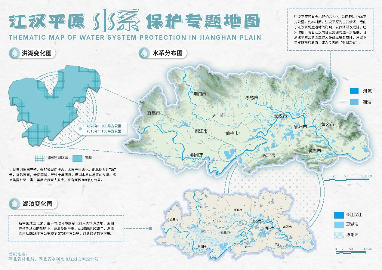 《江汉平原水系保护专题图》紧扣主题:湖与水,包括三幅子图,着重表现河湖水系现状分布及其历史变化。《水系分布图》展示江汉平原河湖水系分布现状。《湖泊变化图》展现湖泊的历史变化。从1950到2019年,江汉平原湖泊面积从8528平方公里减至 2706平方公里,湖泊保护任重道远。《洪湖变化图》展现洪湖治理成效。洪湖曾因围网养殖,近60%湖面被占,水质严重恶化。湖北投入近70亿元拆除围网,全面禁捕,经过十年修复再度恢复宜人风光。