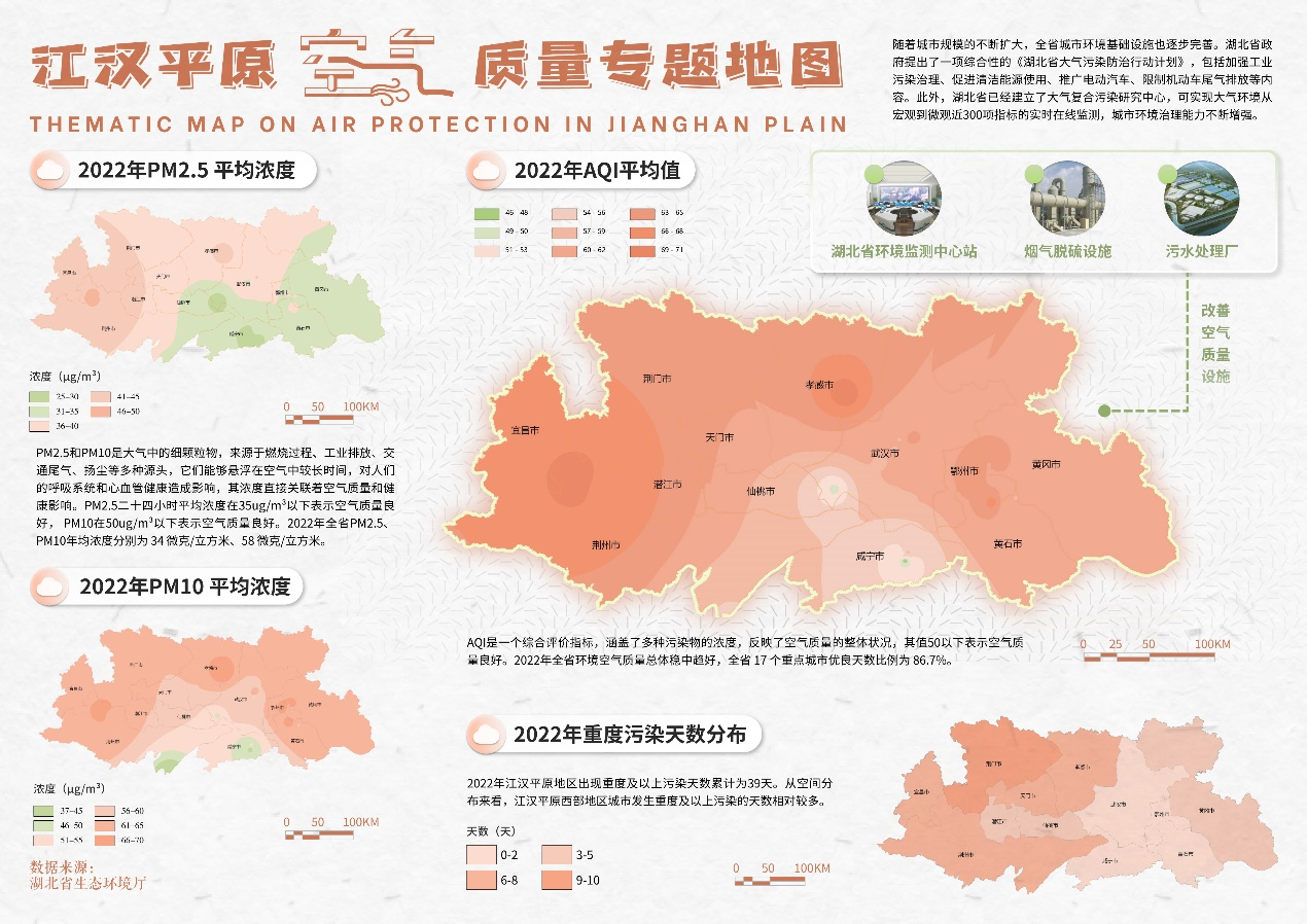 《空气质量专题图》包含四幅子图,分别利用AQI值 PM2点5、PM10、重度污染天数四个指标反映江汉平原空气质量状况。《2022年AQI平均值》通过江汉平原空气质量监测站点的监测数据插值计算,以分层设色的方式展示江汉平原各地的平均空气质量指数。《2022年PM2点5平均浓度》和《2022年PM10平均浓度》展示不同地区的PM2点5和PM10浓度水平。《2022年重度污染天数空间分布》展示了江汉平原各地市重度污染天数的分布情况。