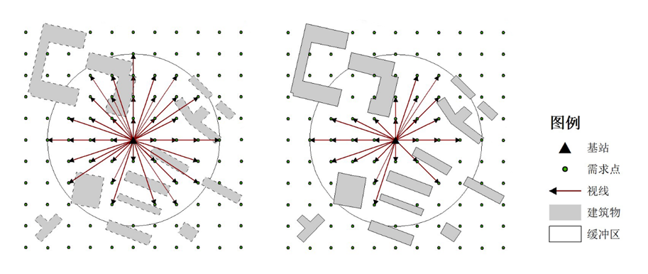 建筑物对5G通信信号的阻隔效应示意图:(a)不考虑建筑物阻隔效应情景下的通信信号传播路径,(b)考虑建筑物阻隔效应情景下的通信信号传播路径