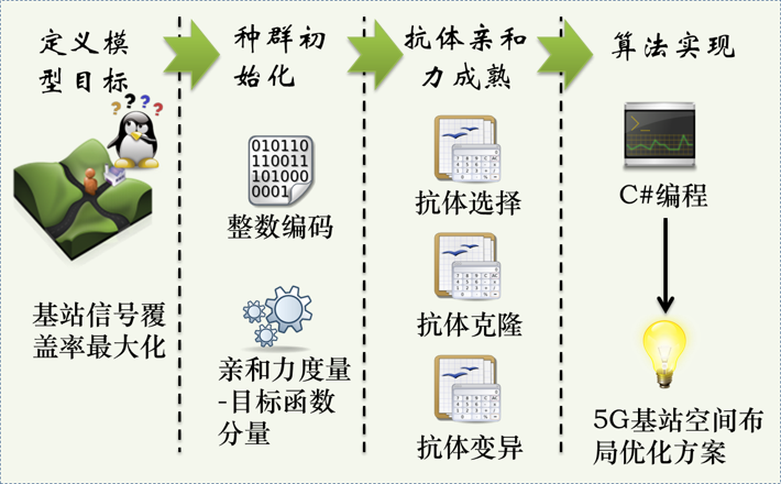 作品首先基于实验区的道路特征、建筑物分布和人口时空分布特征,利用GIS空间分析方法,对实验区的备选基站点和通信服务需求进行了空间分析和建模。在此基础上,利用C#编程语言开发了耦合人工免疫优化算法和空间分析技术的5G通信基站空间布局优化模型,并对实验区的5G通信基站进行了模拟布局和决策支持。