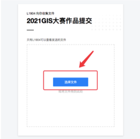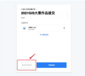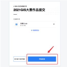 4. 打开提交网址(http://www.giscontest.com/upload),点击“选择文件”,选取待提交的压缩包,在“备注你的名字”一栏输入队长的手机号码,点击“开始发送”,提交页面会显示作品上传进度百分比加载,显示“大功告成”即提交成功。