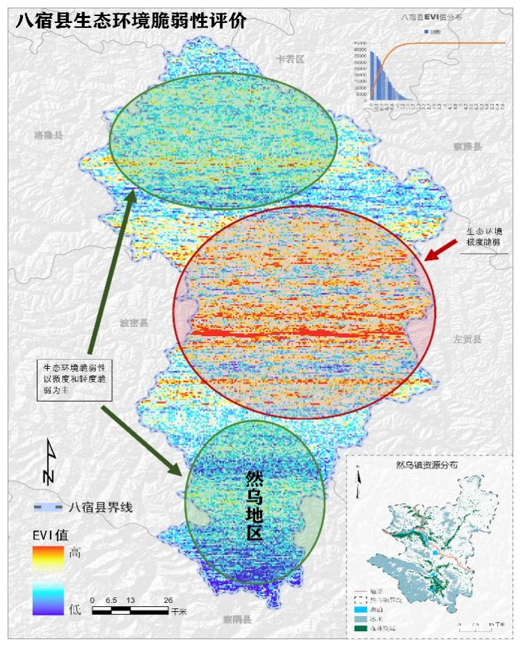 数据导入SPSS,进行格网的标准化处理初选指标,计算相关系数矩阵R的特征值和特征向量,并选取累积贡献率大于85%的3个主成分作为计算指标并确定其评价指标等级fi,完成主成分分析;然后根据前3个主成分的贡献率,在Excel软件中通过AHP计算出主成分1~3的权重wi并通过一致性检验。最后建立生态环境脆弱性评价数学模型,计算得到各像元的脆弱性指数分布:把计算得到的EVI指数导入SuperMap GIS 10i(2020)中,进行属性表赋值,重分级,并进行地图可视化,提取得到合适的研究区范围。