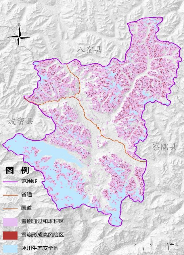 最后将上述雪崩高风险形成区、雪崩通过和堆积区的结果叠合形成雪崩生态安全区。