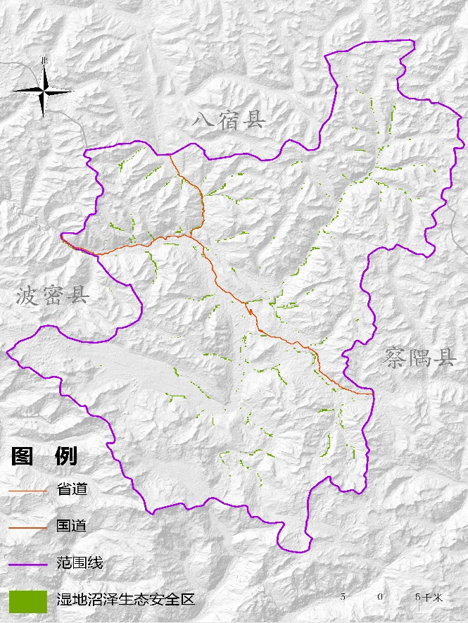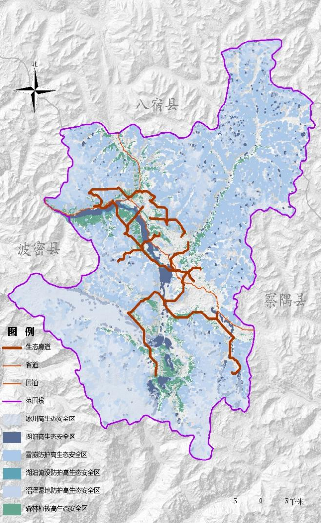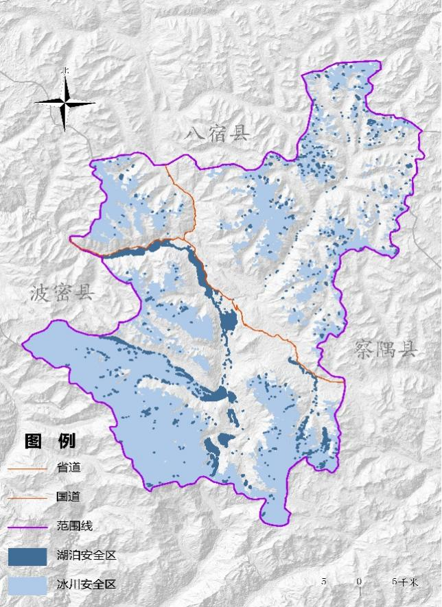 在水体周边划定湖泊和冰川的防护范围,并对两个安全区范围面要素创建防护缓冲区,其中缓冲区距离设置为120米。将湖泊和冰川范围与其缓冲区进行合并操作,共同组成湖泊与冰川生态安全区。