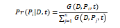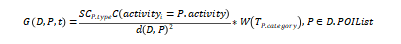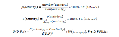 模型I:首先是采用基础重力模型,将距离、时间、建成环境三个因子纳入模型中。其中距离因子采用单车骑行终点与POI间的欧氏距离的平方表示,时间因子则根据不同类型POI的开放时间确定权重,建成环境因子则通过候选区内与该POI具有相同类型的POI总数进行表征,具体公式如下: