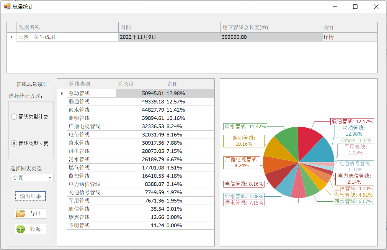 在统计功能上,系统可对数据库中的地下市政数据情况进行总量统计,以及分类统计和分段统计。总量统计可供用户查看数据库中所存放的管线数据基本情况,包括管线总长、管线总数量等,分类统计包括按管线类型统计、管线材质统计、管线所在位置统计等,分段统计可统计不同管线长度范围内的管线数量,统计功能全面考虑了管线的实际应用情况,全面满足用户不同的统计需求。