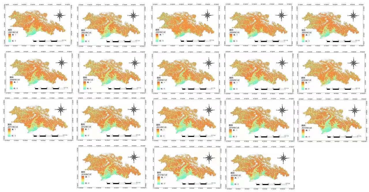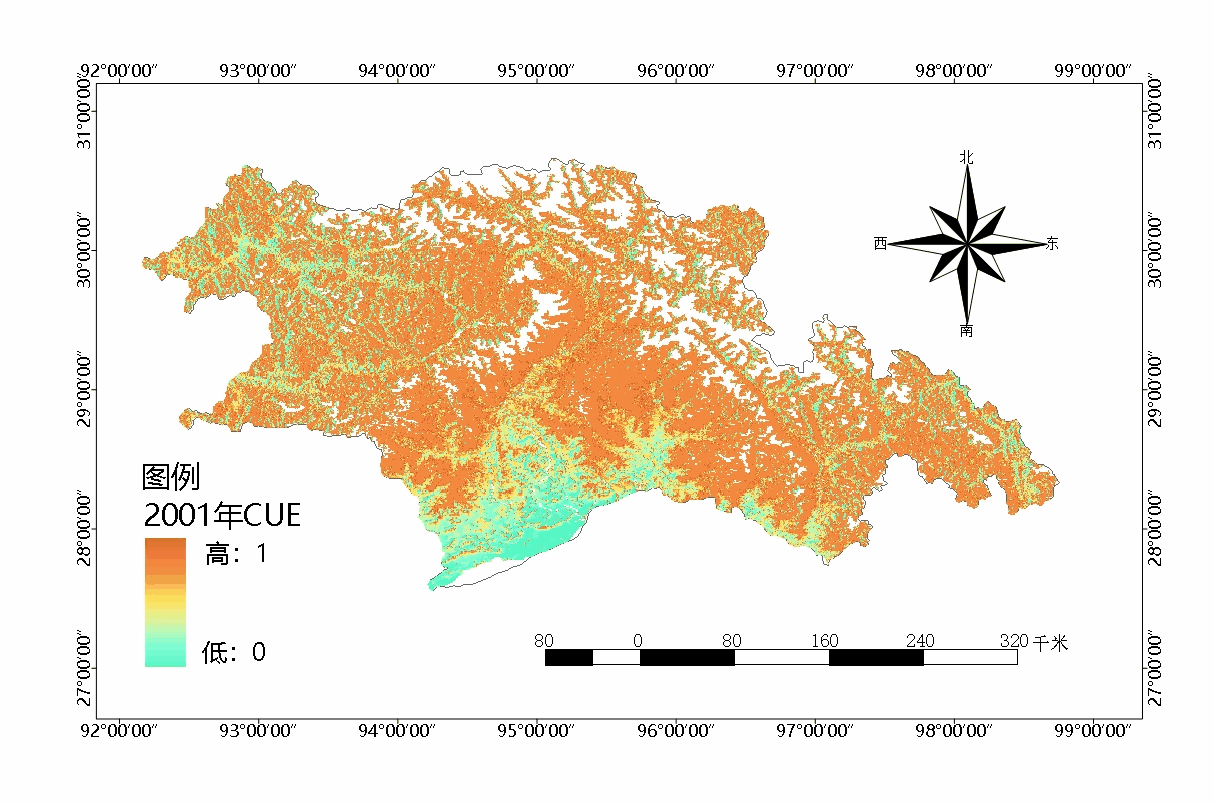 利用SuperMap iDesktop代数运算计算得到植被CUE数据集并进行异常值处理,由于CUE的有效值范围在0到1之间,对计算出的CUE结果进行异常值处理,将有效范围以外,CUE<0的部分赋值为0,CUE>1的部分赋值为1;最后利用SuperMap iDesktop进行专题地图的制作。