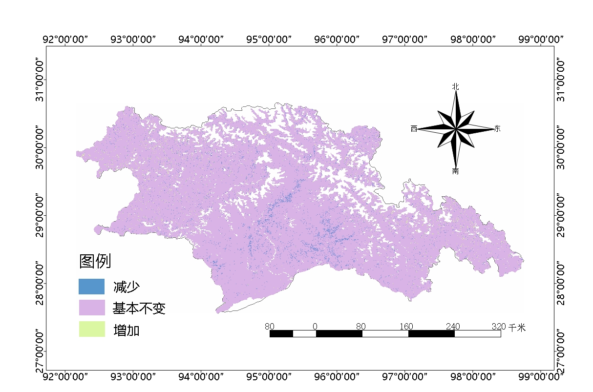 1.5.3 空间维度上,林芝市植被CUE整体呈中部高两侧低、北高南低和河流流域附近相对较低的特点。植被CUE最高值出现在中部的林地,最低值出现在林芝市最南部的东北侧。林芝市2001-2018年均植被CUE整体波动变化不大,绝大部分地区基本不变,中部少部分地区较为集中地呈现减少趋势。