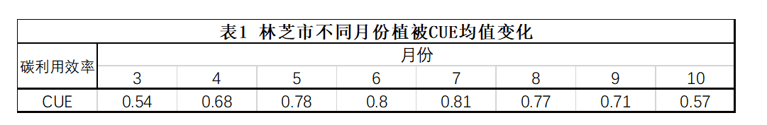 1.5.1 本作品基于MOD17A2H产品计算处理所得的林芝市植被CUE结果基本满足森林CUE在0.23—0.83 之间波动的经验值,具有一定参考性。