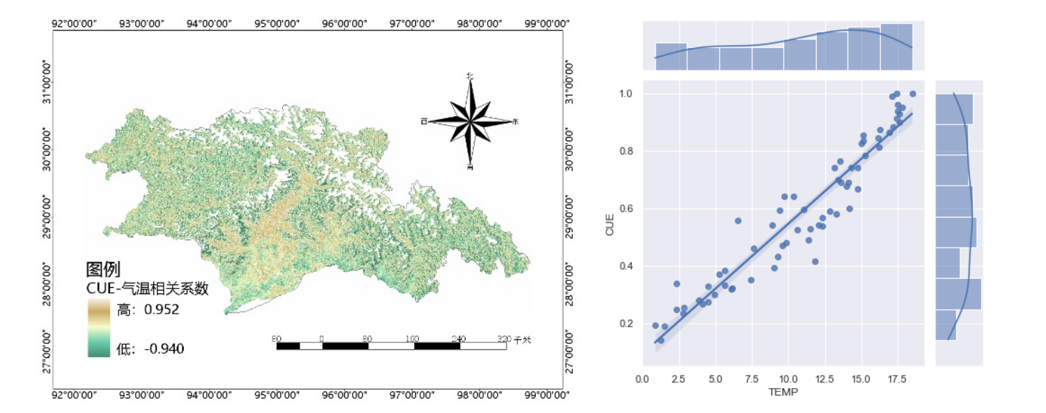 研究成果创新地探究藏东南森林生态系统固碳能力,为理解认识碳循环机理提供新思路。借助植被CUE数据集及专题地图的碳利用效率时空变化格局和差异驱动因素,并基于植被CUE数据集进行时间序列预测。研究的开展,明晰了林芝市森林生态系统的碳循环时空变化,不仅可以为藏东南森林生态系统科学管理提升固碳效应提供科学依据,而且对青藏高原屏障区中的高寒森林生态系统高质量发展具有重大科学和现实意义