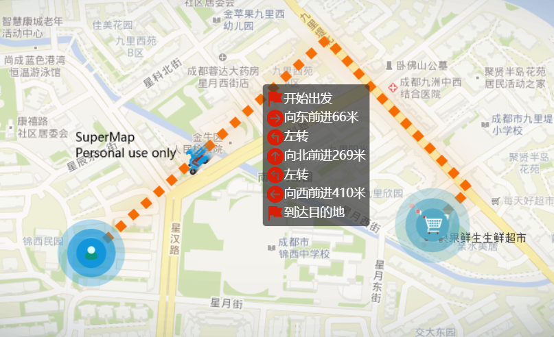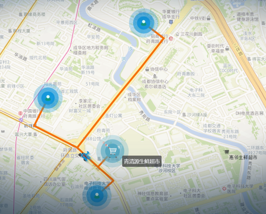 用户拉框指定一个超市,并在地图上标记多个点事件点进行配送分析,系统为用户查找出到达这些事件点总路径最短的配送路线,并在地图上高亮显示配送路线,添加路线指引。