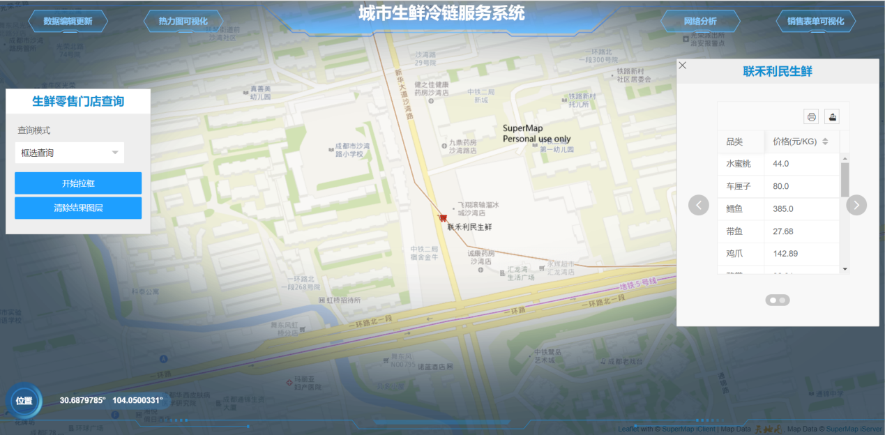 用户查询生鲜零售门店,被选中的门店高亮显示,点选某一个门店,地图定位至该门店,在弹窗中以表格和柱状图轮播切换的方式展示该门店内的生鲜品类价目信息。