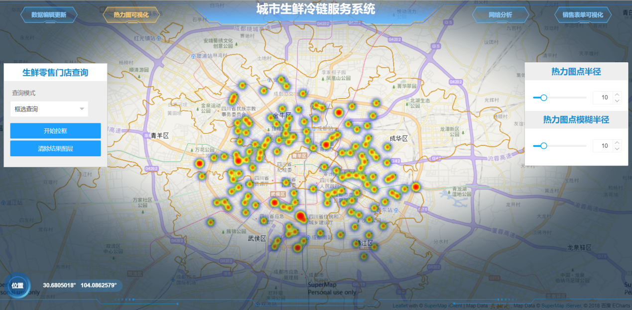 系统将生鲜零售门店在主城区分布的密集程度以热力图的方式展现给用户,用户可以拖拽滑块修改热点半径和热点模糊半径。