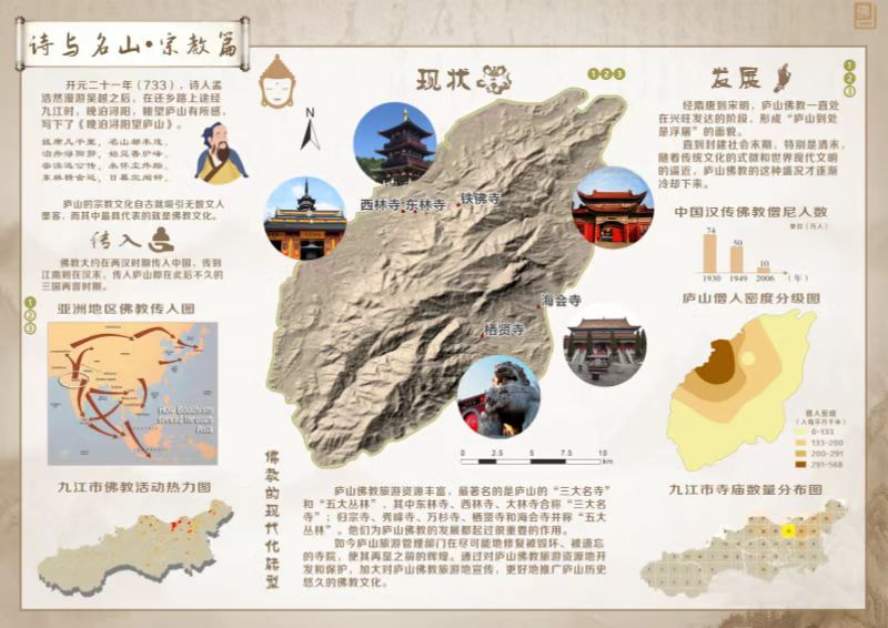 “一山藏六教, 走遍天下找不到”,在这座云雾缭绕的灵山中, 释道两教从互 争雄长走向携手共勉;在这座缥渺的仙山中, 移植来了基督教(新教)、天主教、 东正教、伊斯兰教四颗具有极强生命力的“文化”,它们在庐山生根发芽, 茁 壮成长, 把庐山变成了宗教的荟萃地, 神灵的伊甸园, 宗教文化在庐山文化中 的独特地位极为显著。 在本图中, 我们选取佛教代表介绍庐山的宗教文化。页 面中央的庐山地图上, 标注有庐山的代表性寺庙, 如西林寺、海会寺等; 右侧 柱状图显示出不同时间点下庐山的汉传佛教僧尼人数;对于庐山的僧人密度, 我们以热力图的形式在庐山地图上进行表达; 图面上还配有相关文字, 介绍庐 山佛教的传入、现状与发展。