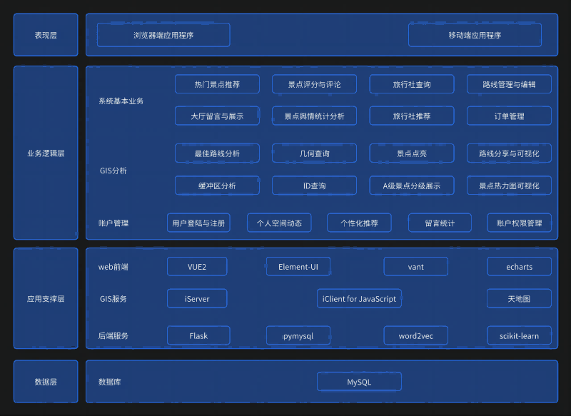 系统整体使用B/S架构,分为浏览器端应用程序和移动端应用程序,使用iServer进行GIS服务发布,web前端主体使用VUE框架,服务器端使用Flask框架,使用SuperMap iClient JavaScript for Leaflet进行GIS空间分析操作。
