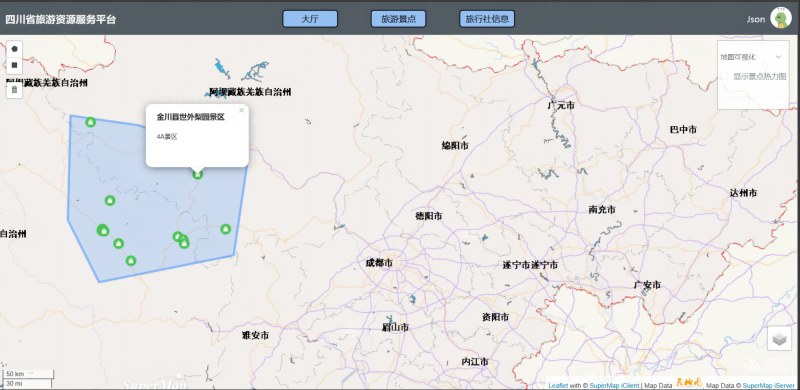 系统面向旅游资源服务体系,既能展现四川省的旅游景点风光,又能满足游客对景点信息、旅行社信息的快速查询,并支持旅游景区最佳路线查询与规划,而且移动端还兼顾个人主页分享的社交功能,为旅游资源服务产业提供了地理信息技术解决方案。