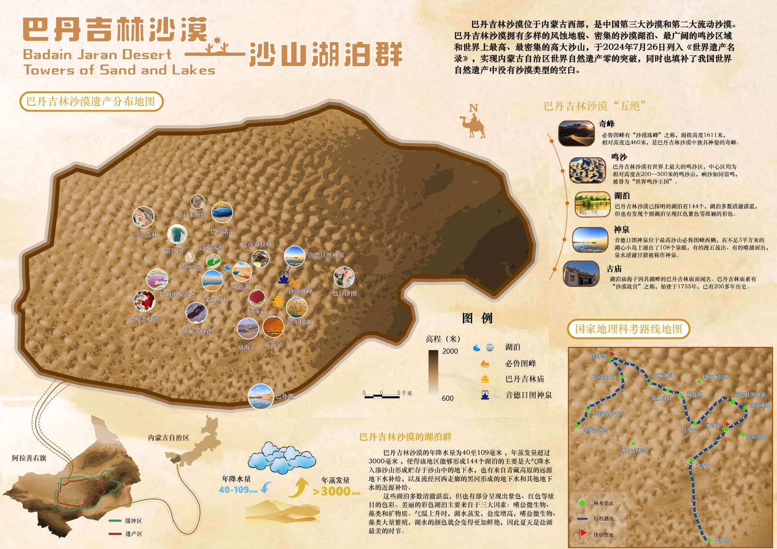 地图《巴丹吉林沙漠——沙山湖泊群专题地图》展示了世界自然遗产巴丹吉林沙漠——沙山湖泊群的基本情况。主图底图为巴丹吉林沙漠的DEM数据的分层设色地形,同时地图中添加了湖泊、古庙、神泉等遗产点和实景图片。我们还绘制了国家地理科考路线图、自制了插画介绍巴丹吉林沙漠中湖泊群的形成原因,将科普融入地图设计中。