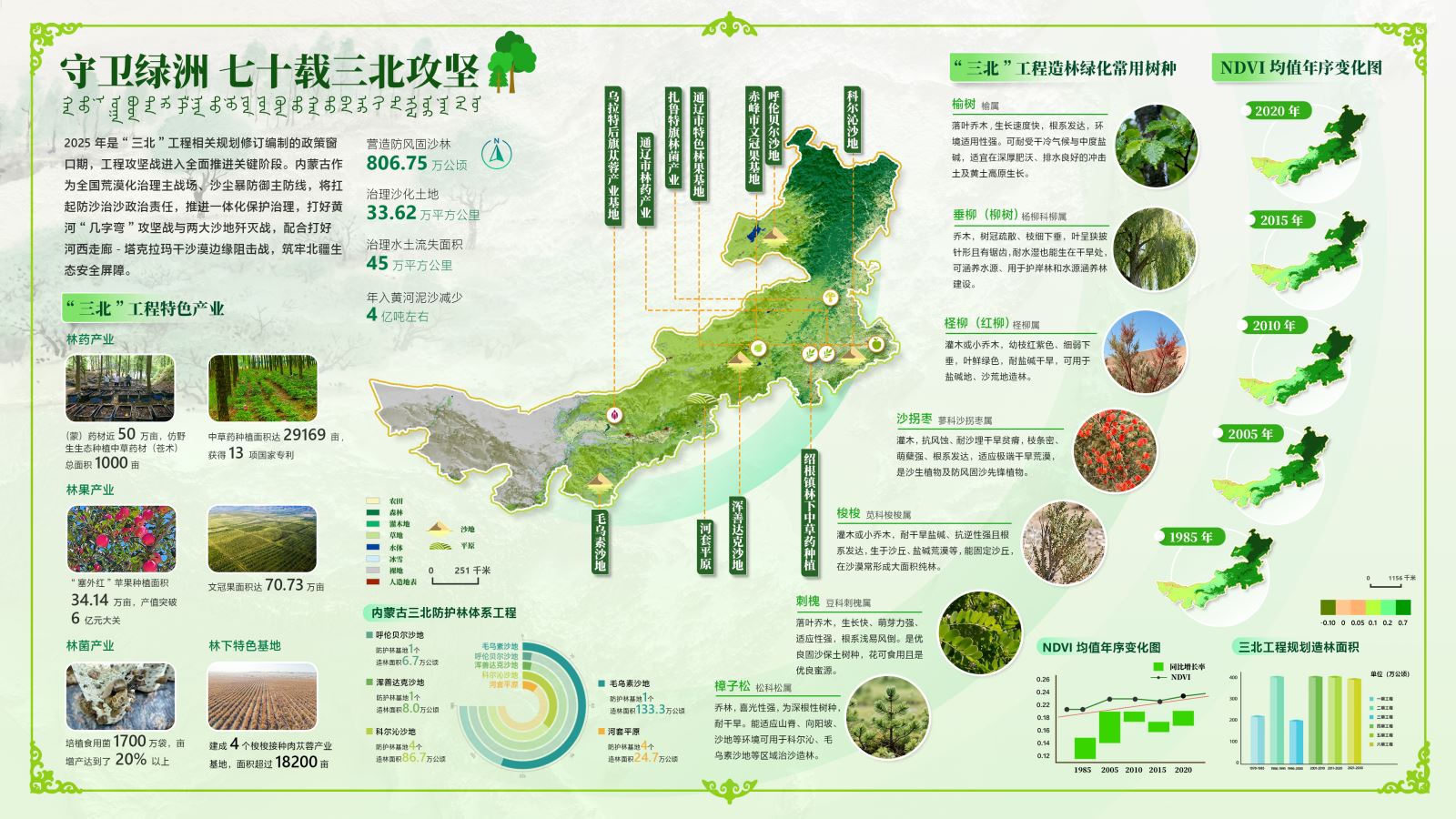 《守卫绿洲-七十载三北攻坚》着重展示内蒙古自治区区域协同造林的战略部署。主图为内蒙古自治区地表覆盖类型图,重点突出林地总体分布格局和“三北”工程重点治理区域规划,标注出呼伦贝尔沙地、浑善达克沙地、科尔沁沙地、河套平原和毛乌素沙地五大重点造林区域,以展现内蒙古自治区造林事业的规划形势。配图为1985年至2020年内蒙古NDVI 均值年序变化图,从时间的纵深角度展现“三北”工程的生态环境改善成果,相应统计图表提供详细数据。图幅罗列樟子松、刺槐、榆树等“三北”工程造林常用树种及其生长习性,是因地制宜开展生态环境治理原则的生动体现。整体配色丰富鲜明,以深绿色为主。精准呼应“守卫绿洲、生态治理”的核心主题,传递出自然、环保、充满生机的视觉感受,直观强化了“三北工程”改善生态的价值导向。