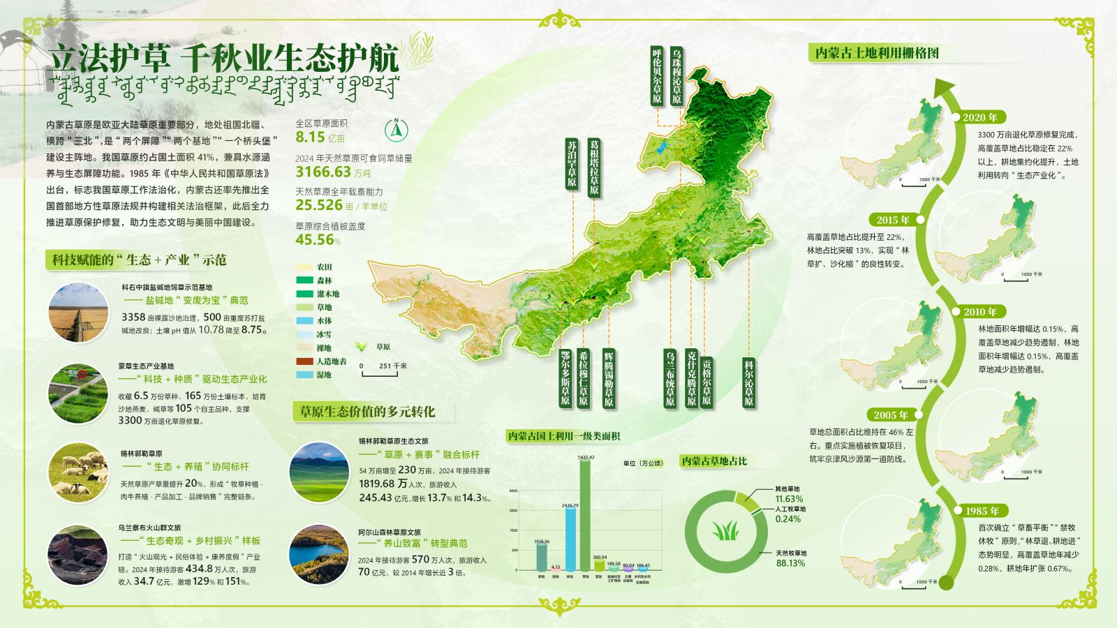 《立法护草-千秋业生态护航》以内蒙古自治区草原资源现状及其时空变化为核心成图。“草”是蒙古高原最具代表性的自然符号,是蒙古高原最古老的生命体。合理保护和有效利用“草”资源是内蒙古自治区推进“三北”工程建设的根本前提和重要支点。主图为内蒙古自治区土地利用专题图,展现出内蒙古丰富的草原资源。同时结合1985年到2020年的土地利用栅格图,清晰直观地表现出四十年间“草沙”界线的移动趋势,进而反映内蒙古草原生态修复和保护的工作成绩。该图以草原法治体系建设为线索,有机结合草地占有量和植被覆盖度等科学数据。图面左侧聚焦草原科技赋能的“生态+产业”优秀示范和草原生态价值多元转化的优秀案例,生动诠释了“在保护中发展,在发展中保护”的治理理念。该图配色以浅绿色调为主,形象符合大众对草原青翠欲滴、绵延千里的认知。在读图时使观赏者仿佛已然踏上蒙古高原,在蓝天白云下眺望翠绿画卷铺展开来。