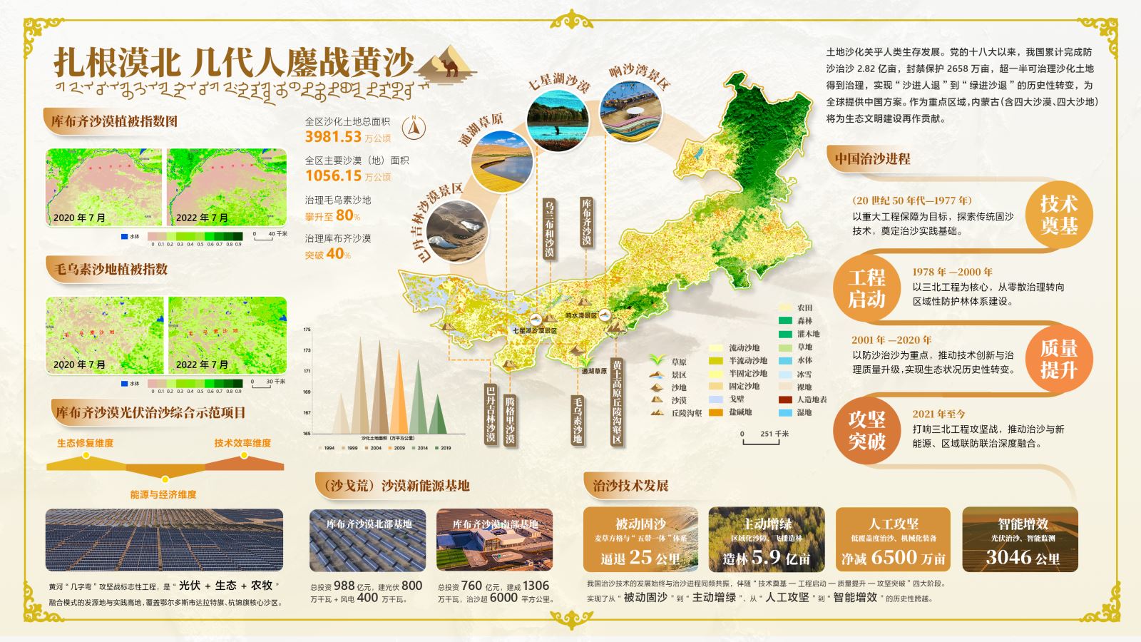 《扎根漠北-几代人鏖战黄沙》着眼于内蒙古自治区土地沙漠化和荒漠化的系统治理。内蒙古自治区幅员辽阔,兼有广阔草原和诸多沙漠沙地,要想有效推进“三北”工程开展,必须着力解决“草”和“沙”的矛盾。主图为内蒙古自治区沙地类型专题图,直观具体地展现了流动、半流动、固定和半固定等沙丘类型,对研究土地沙化演变趋势具有重要意义。同时搭配库布齐沙漠和毛乌素沙地植被指数图,增强沙化治理的区域横向对比效果。图面右侧,通过时间坐标轴的形式梳理中国治沙进程,治沙事业历经技术奠基、工程启动、质量提升和攻坚突破四个阶段,不断实现治沙技术新突破。同时展现内蒙古创新性发展的库布齐沙漠光伏治沙综合示范项目和沙漠新能源基地。整体配色采用黄色系展示沙漠沙地的实体形象,整体图面有绿色点缀,寓意内蒙古自治区“在漫漫黄沙中增添绿植”的生态修复工程特质。