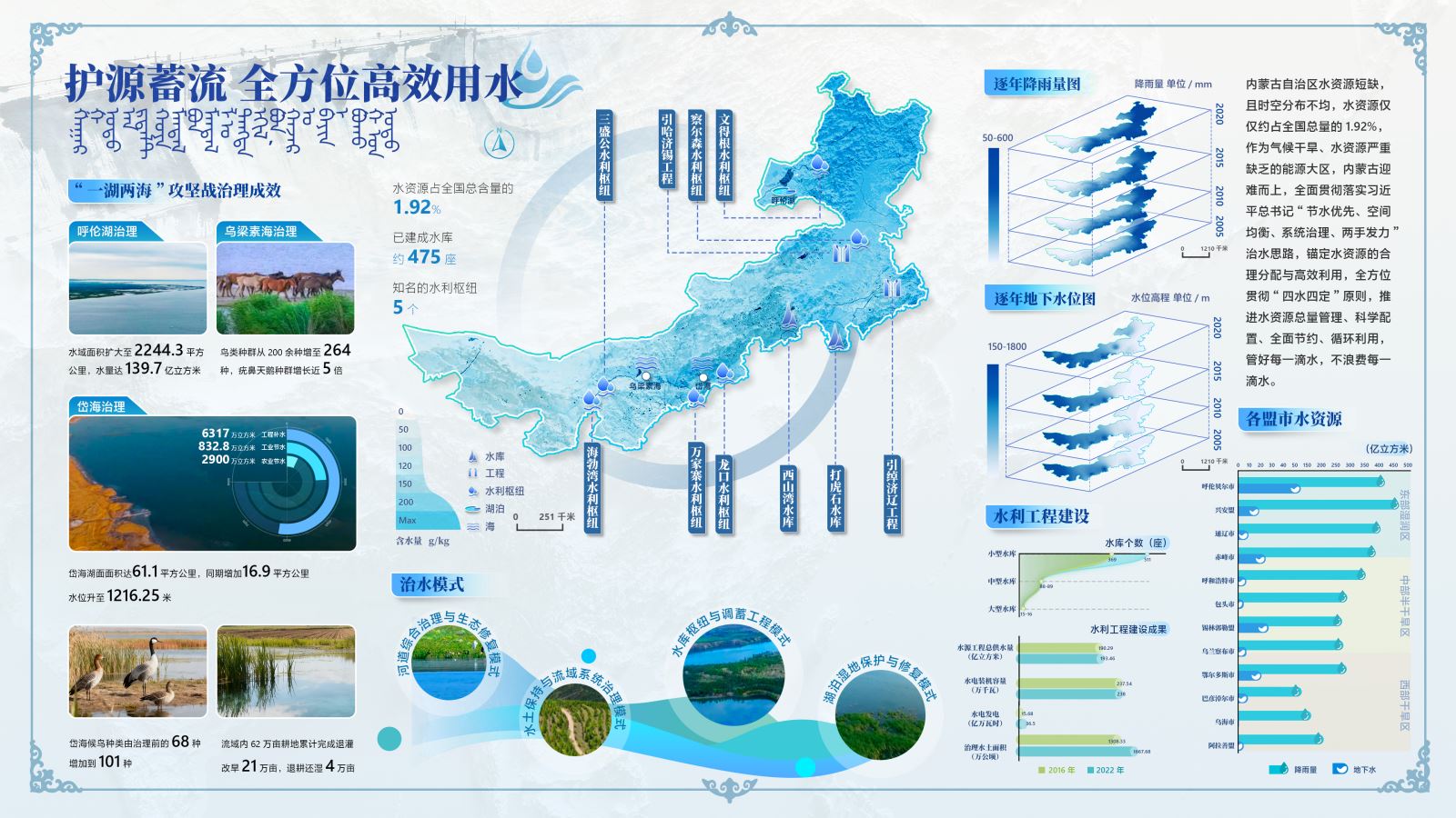 《护源蓄流-全方位高效用水》重点阐述内蒙古自治区水资源状况及其高效利用。内蒙古自治区水资源短缺且时空分布不均,作为气候干旱、水资源严重缺乏的能源大区,内蒙古迎难而上,全面贯彻落实习近平总书记“节水优先、空间均衡、系统治理、两手发力”治水思路。主图为内蒙古自治区含水量图,全面展示内蒙古各地区水资源总体状况,其中重点标注出三盛公、海勃湾、万家寨、文得根和察尔森五大知名水利枢纽,展现内蒙古空间水资源系统治理的重大进展。配图为内蒙古逐年降水量图和逐年地下水位图,以分层呈现的形式系统展现降水量和地下水位的变化,为预测水资源发展趋势提供有力参考。同时搭配内蒙古自治区十二盟市降水量和水资源空间对比统计表,形成纵横覆盖的评估网络。图面左侧聚焦“一湖两海”攻坚战治理成效,以呼伦湖、乌梁素海和岱海为代表,展现治理期间湖泊蓄水量和生物多样性的改善情况,同时重点突出河道综合治理与生态修复、水土保持与流域系统治理等治水模式。配色采用浅蓝色调,符合“水”的物理形象。与其他图幅色调的差异给读者以焕然一新的感觉,减少视觉和审美疲劳。文字部分适当地采用深蓝色,使文本表现清晰;而面积较大区域采用浅蓝色系,使整体画面配色协调。