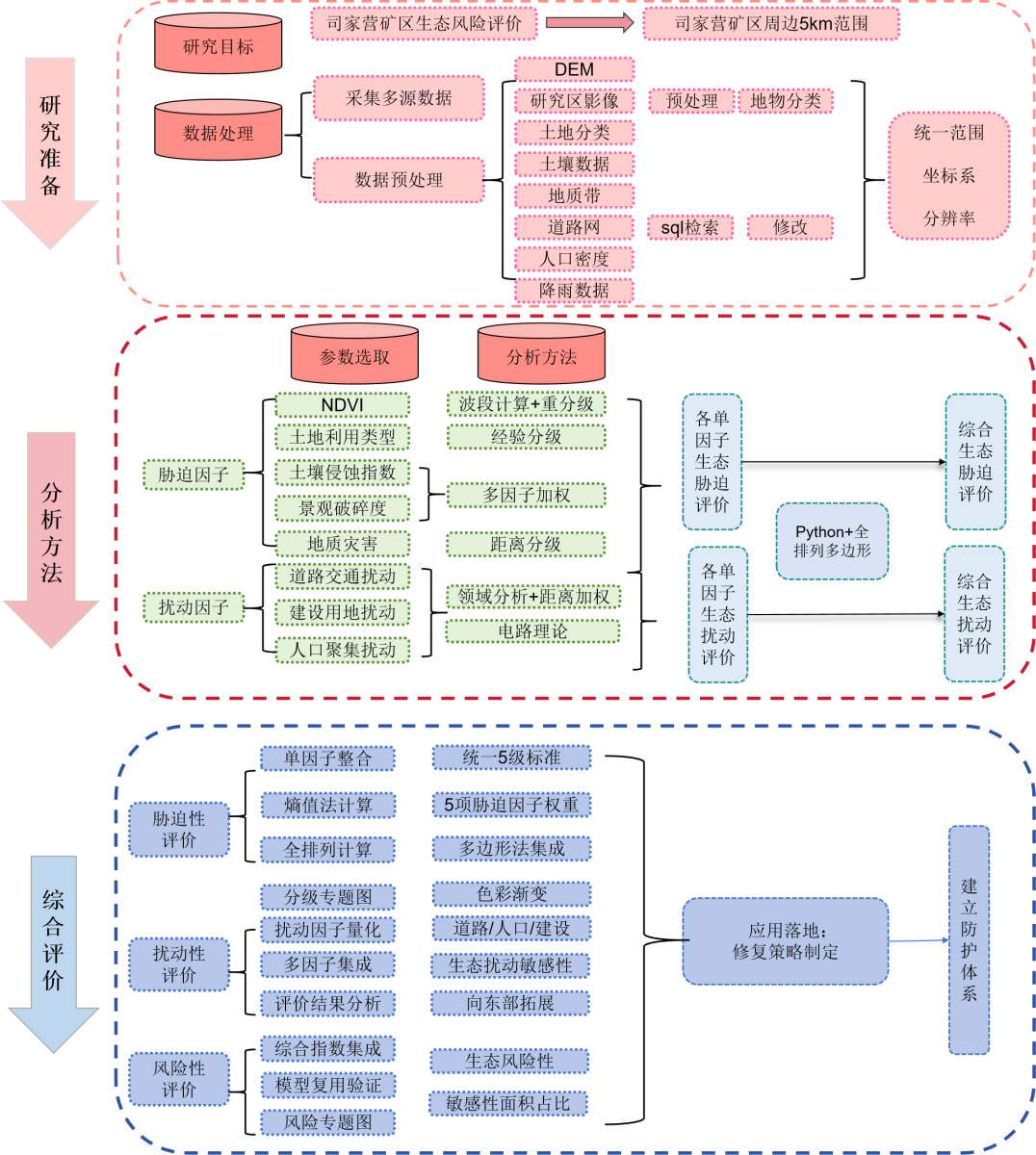 本研究主要使用SuperMap iDesktopX进行数据分析与地图制作。主要综合GIS,熵值法,RUSLE模型,Python+全排列多边形等算法,建立“胁迫——扰动”模型,从自然胁迫和人为扰动两个维度展开对研究区的生态综合风险研究。主要技术路线如下图所示。