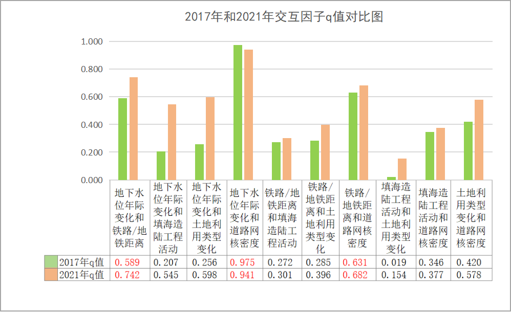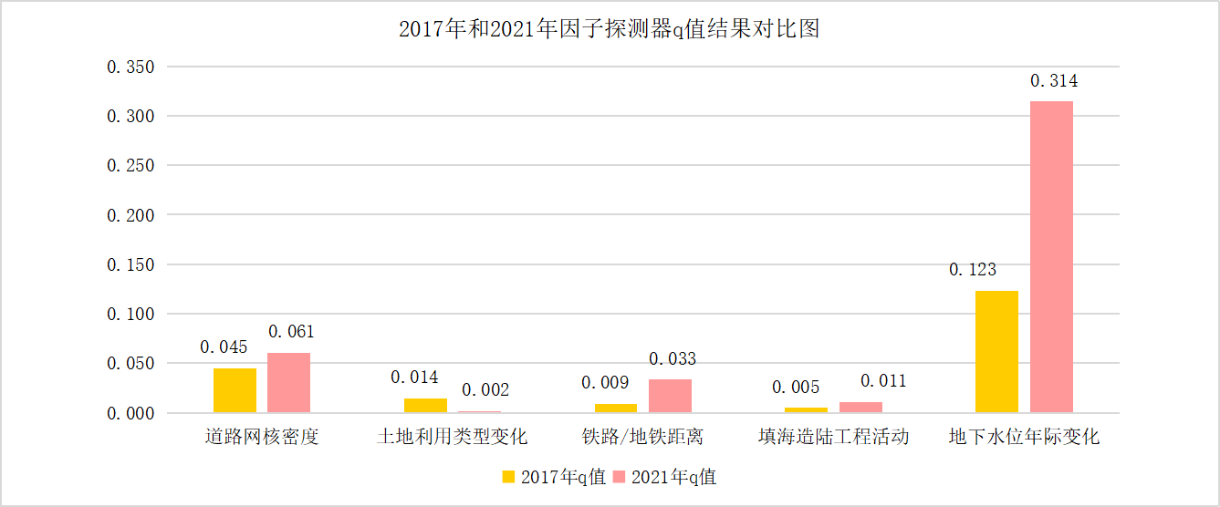 因子探测结果分析。如表2和图9所示,对比2017年与2021年各驱动因子的q值(地理探测器中表征因子对沉降分异的解释力),可揭示深圳沉降驱动机制的时间演变特征。