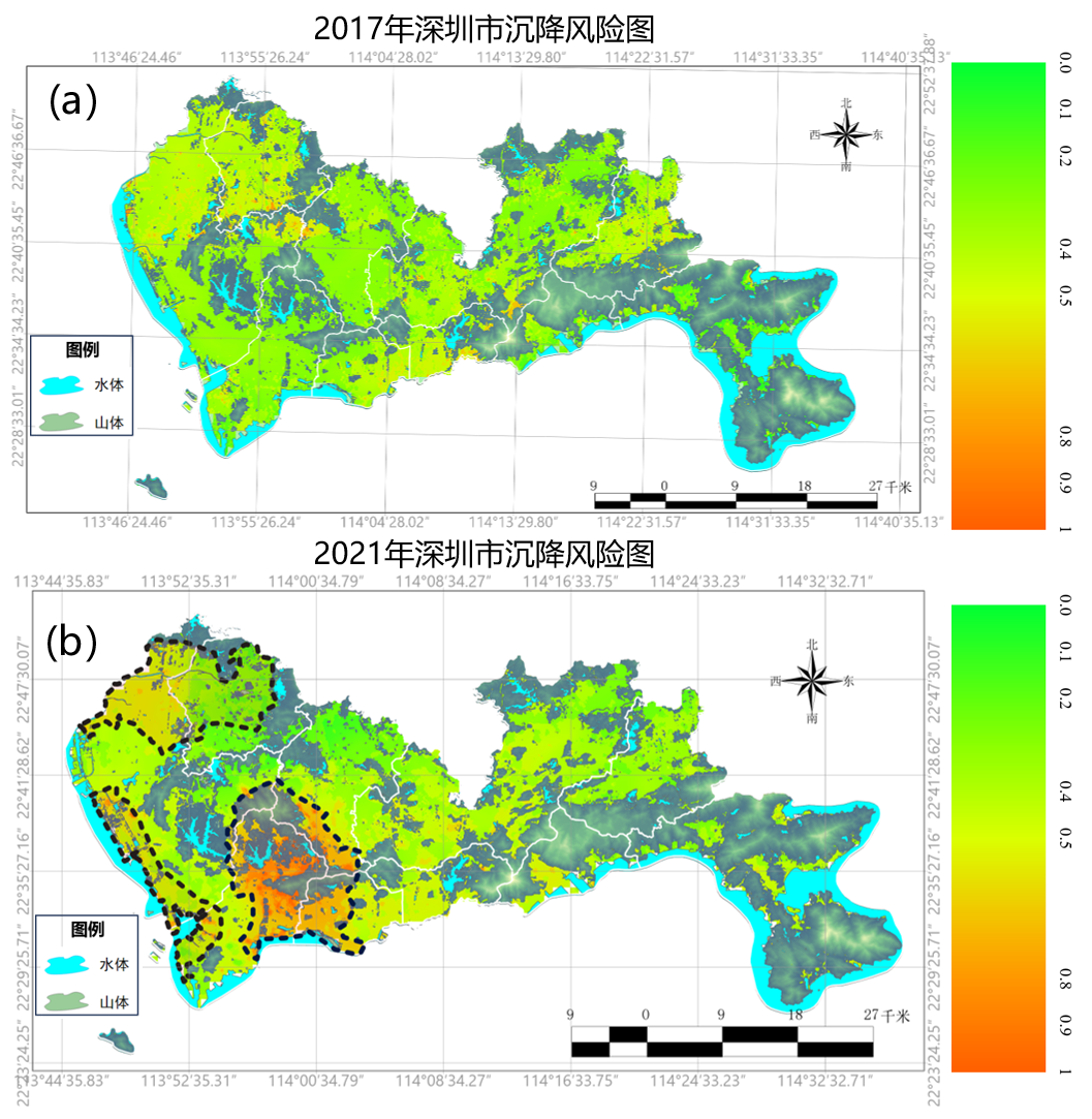 图11 a.2017年深圳市沉降风险图;b.2021年深圳市沉降风险图