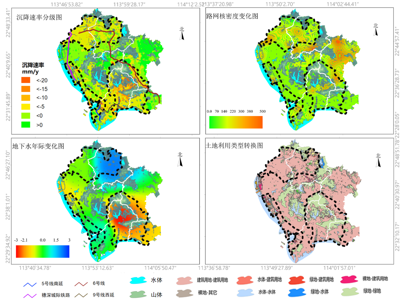 结果表明,深圳地表沉降呈“西部核心、中部扩张、东部稳定”的格局;深圳地面沉降驱动机制以“交通因子”(铁路/地铁距离和道路网加密)、“水文因子”(地下水位年际变化)以及土地利用开发扩张三大因子协同作用的结果,并识别出三大风险区域。
