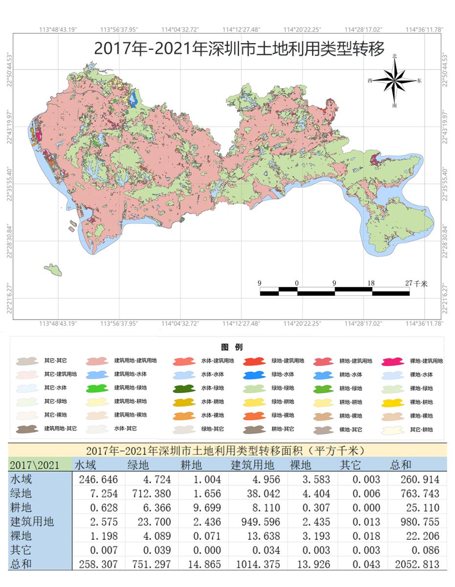 基于2017年-2021年深圳市土地利用类型转移面积(平方千米)表格,结合2017至2021年土地利用类型变化图(图4),能深入剖析各类用地的转移方向与强度。2017-2021年深圳市土地利用类型以建筑用地扩张为核心,其外源输入总量约64.78平方千米(净增 33.62平方千米),主要源于绿地(占比58.7%)、裸地(21.1%)、耕地(12.5%)和水域(7.6%)的转入;土地类型变化整体分散,主要集中在西部沿海填海区域、北部光明区、龙岗区东北部及大鹏新区白沙湾。