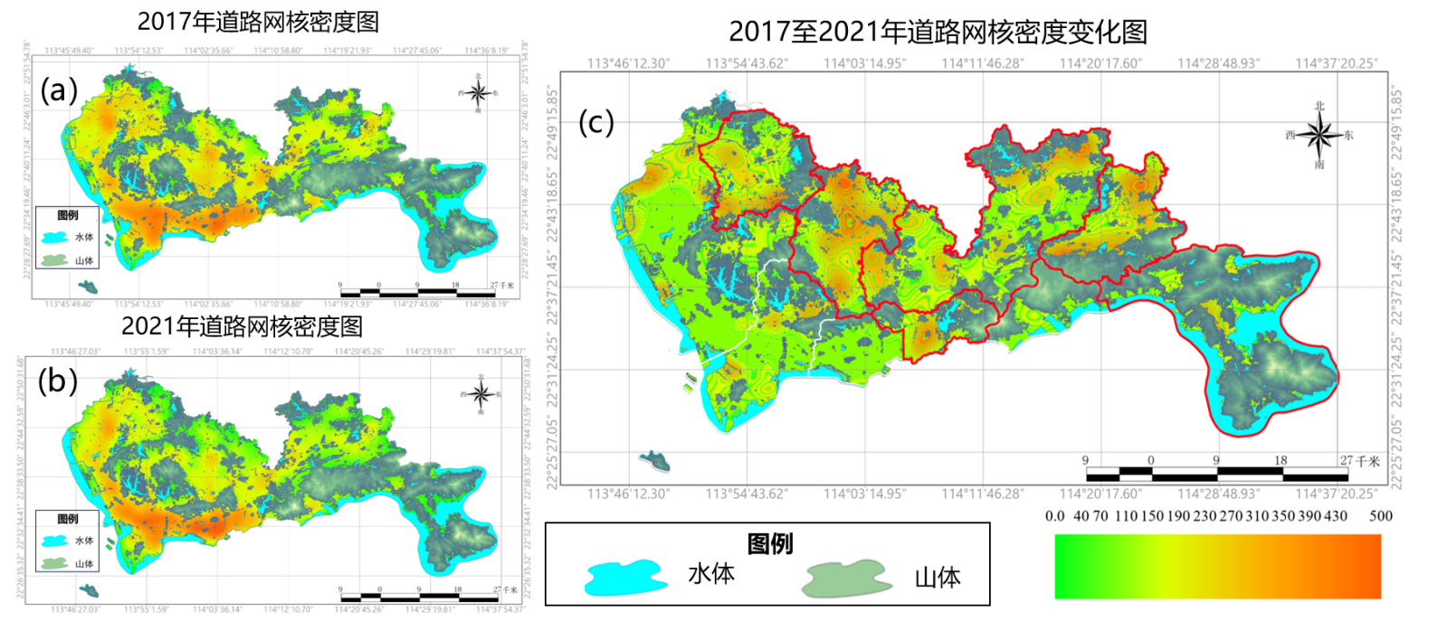 图7 a.2017年道路网核密度图;b.2021年道路网核密度图;c.2017至2021年道路网核密度变化图