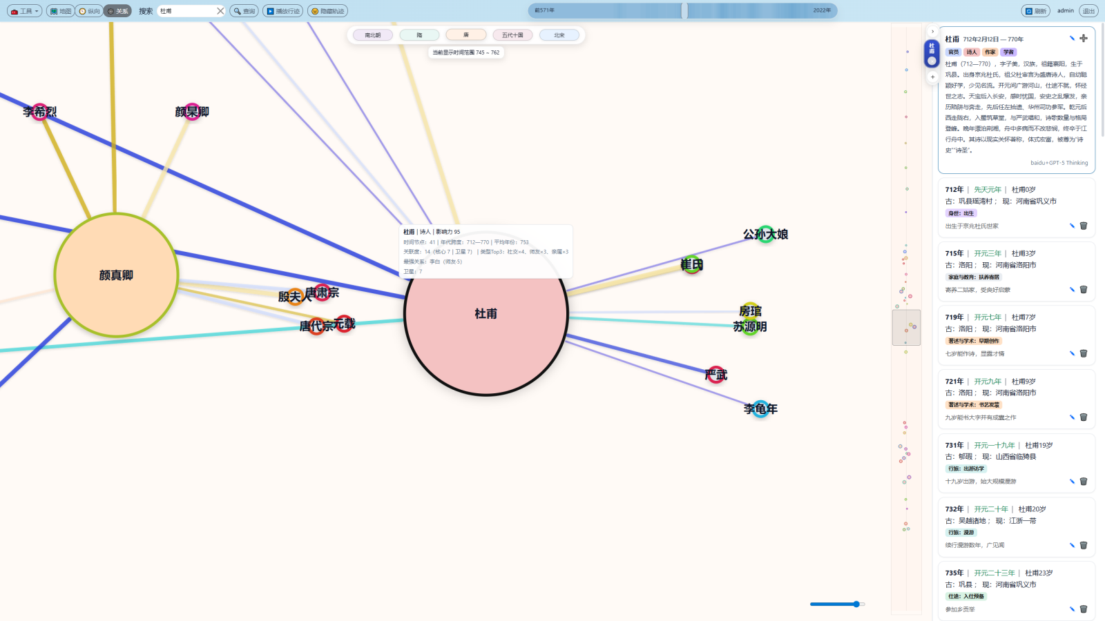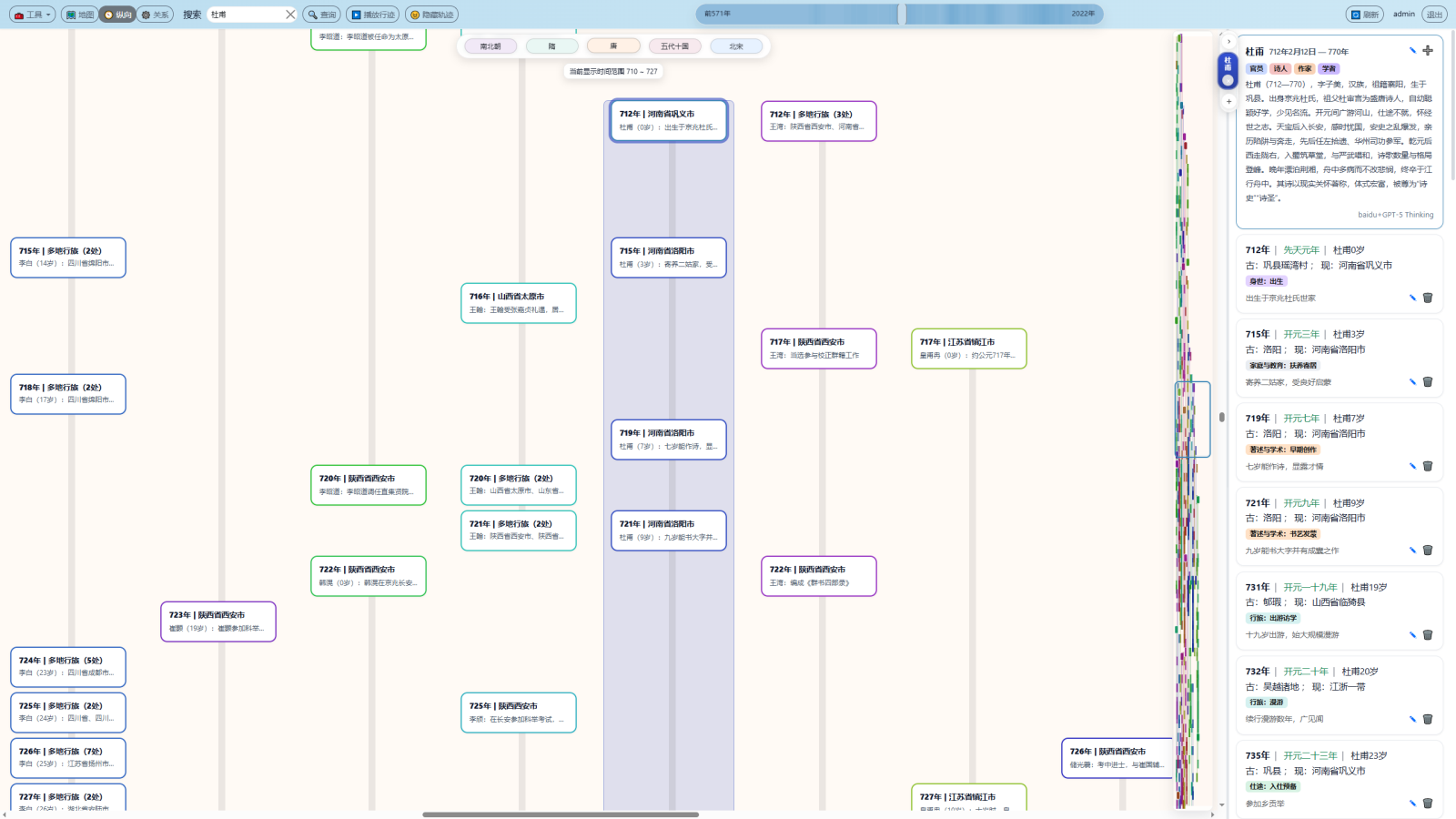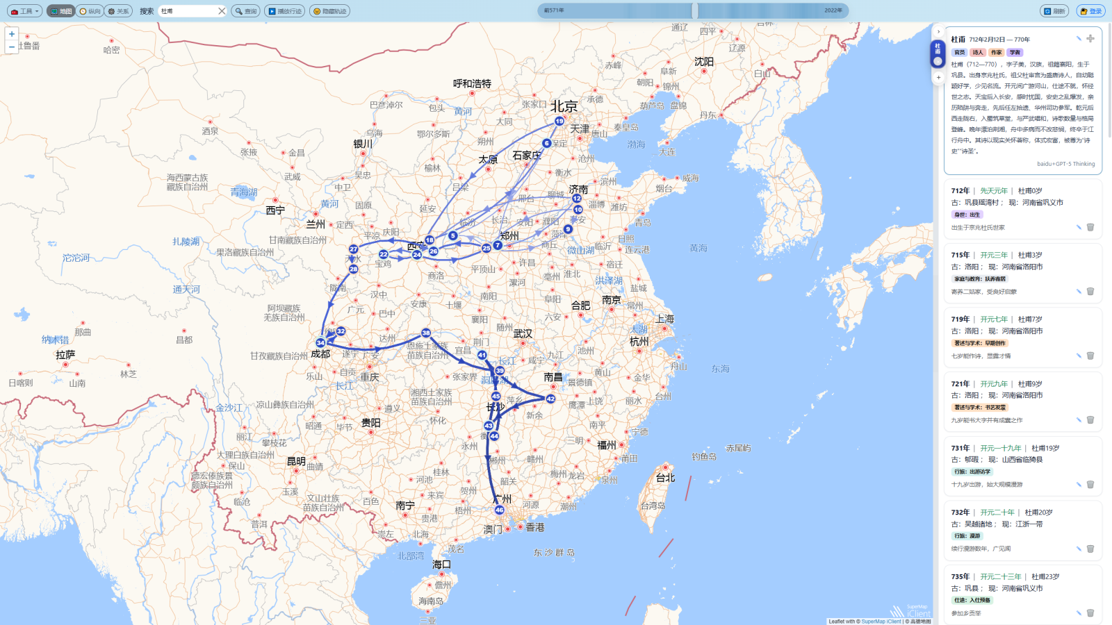第一,“只知何年,不知何地”。人物生平的关键转折(入京、贬谪、远游、避乱、还乡等)在时间轴上清晰,但其空间位置、迁徙路径与地理环境缺乏直观承载,难以把握事件发生以何处为中心、与周边区域有何联系。