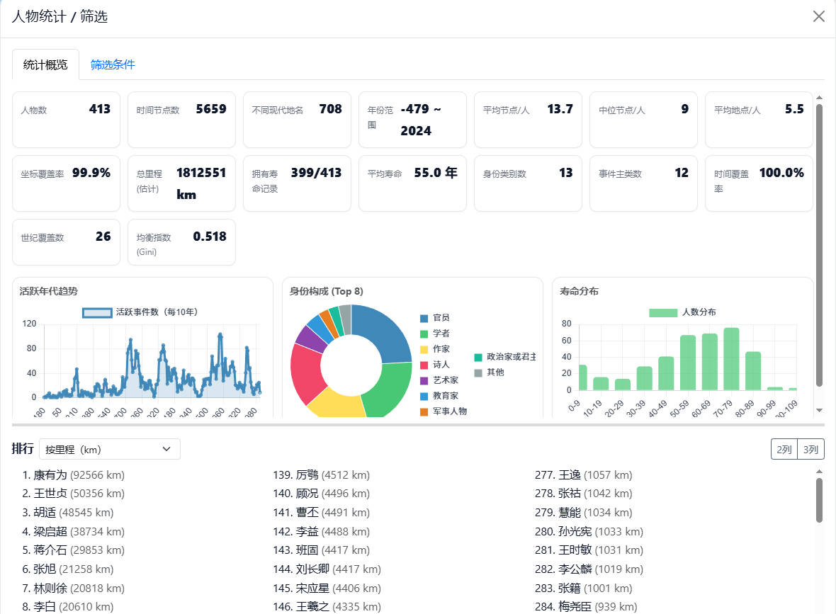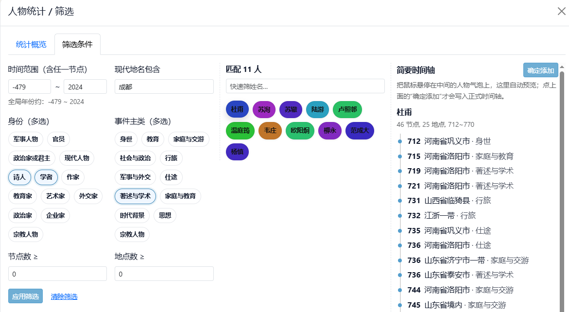 统计工具支持面向单人物或全体人物的汇总对比,并可按时间、地点、身份与事件类别等条件筛选,得到可复用的量化结果。