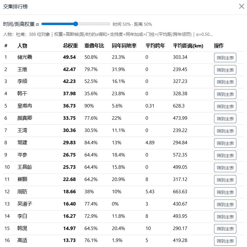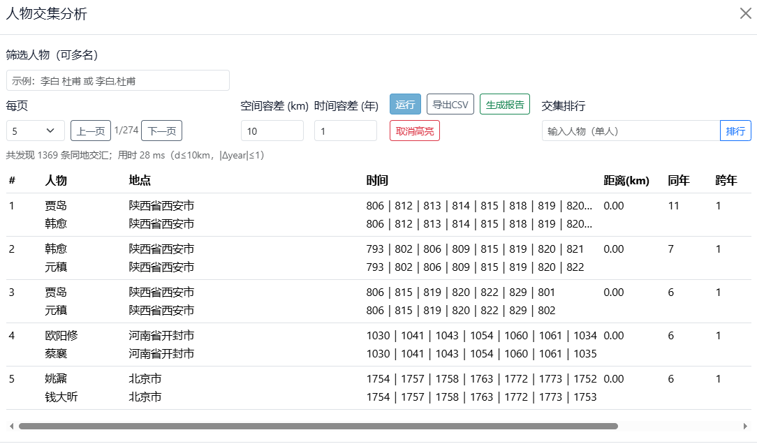 同时支持查看某一人物与其他人物的交集得分排行榜,并允许调整时间与距离权重以适配不同研究侧重点。