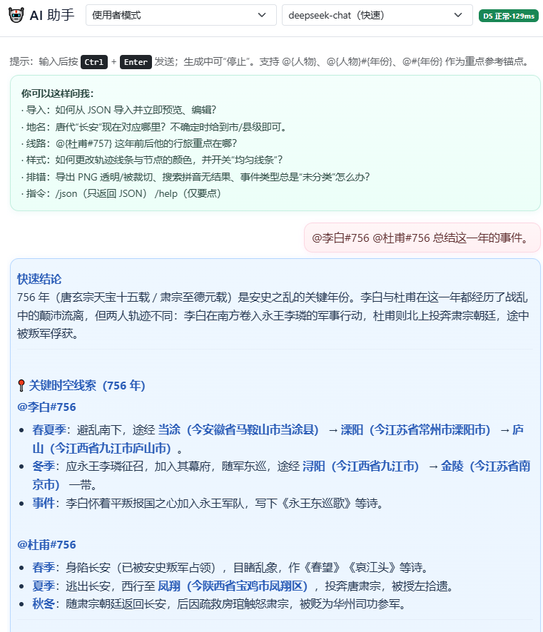 依托DeepSeek等大语言模型,系统构建“半自动史官”机制,实现用户提问、上下文组装、模型生成、结构化回答、数据反哺的闭环式叙事路径。用户可就特定人物、节点或时间段提出问题,系统自动生成符合历史语境的解释,部分结果还可回写时间轴或地图摘要,提升系统的知识延展性与可解释性。