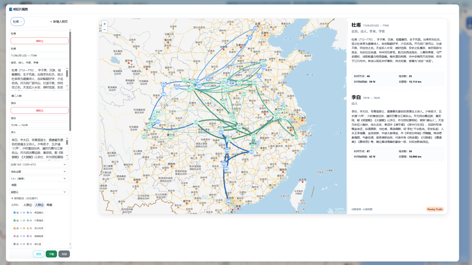 用户选择人物、时间段与视图配置后,可一键生成明信片 PNG 成果,用于答辩展示、课堂材料与对外传播;当前模板支持最多同时展示两位人物。明信片提供预设版式与配色方案,支持轨迹线样式快速套用,同时允许对右侧说明信息与文本内容进行按需编辑。生成结果可与版本快照结合管理,便于复现、对比与迭代维护。