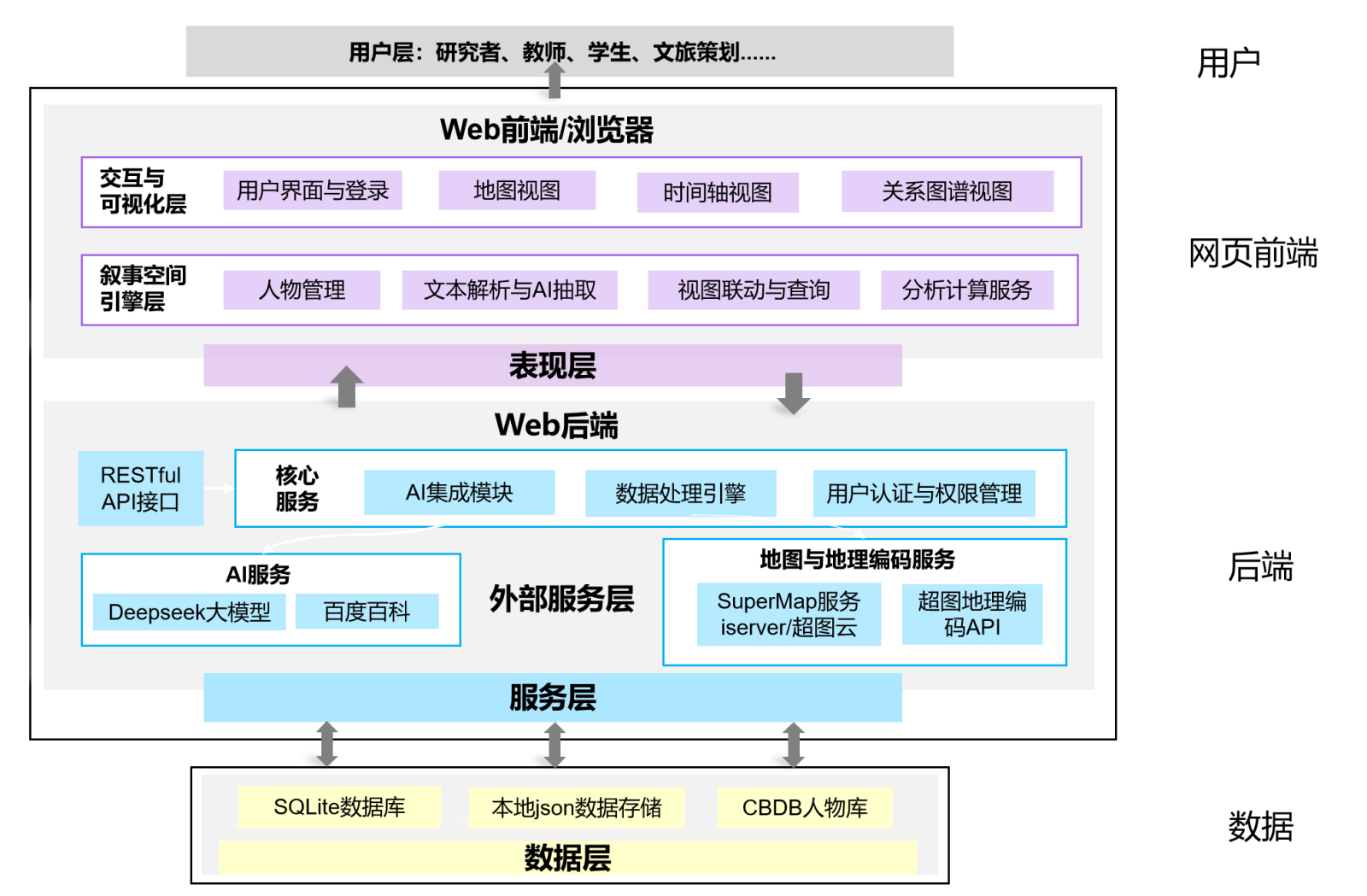 后端层面,系统以服务化方式承载核心处理逻辑,并向前端提供统一数据接口。后端包含核心服务与数据处理引擎:核心服务负责人物、时空节点与轨迹等业务对象的组织、查询与结果封装;数据处理引擎将多源文本信息结构化为四元组,并进一步生成可计算的时空节点与轨迹数据,为联动展示与分析统计提供标准化输入。为提升自动化抽取与解释能力,系统在外部服务层对接AI与地理服务:AI侧接入DeepSeek大模型与百科信息,用于文本抽取辅助、内容补全与问答导览;空间侧对接SuperMap iServer/超图云及超图地理编码API,用于底图与空间服务调用,以及地名标准化与坐标化落地。