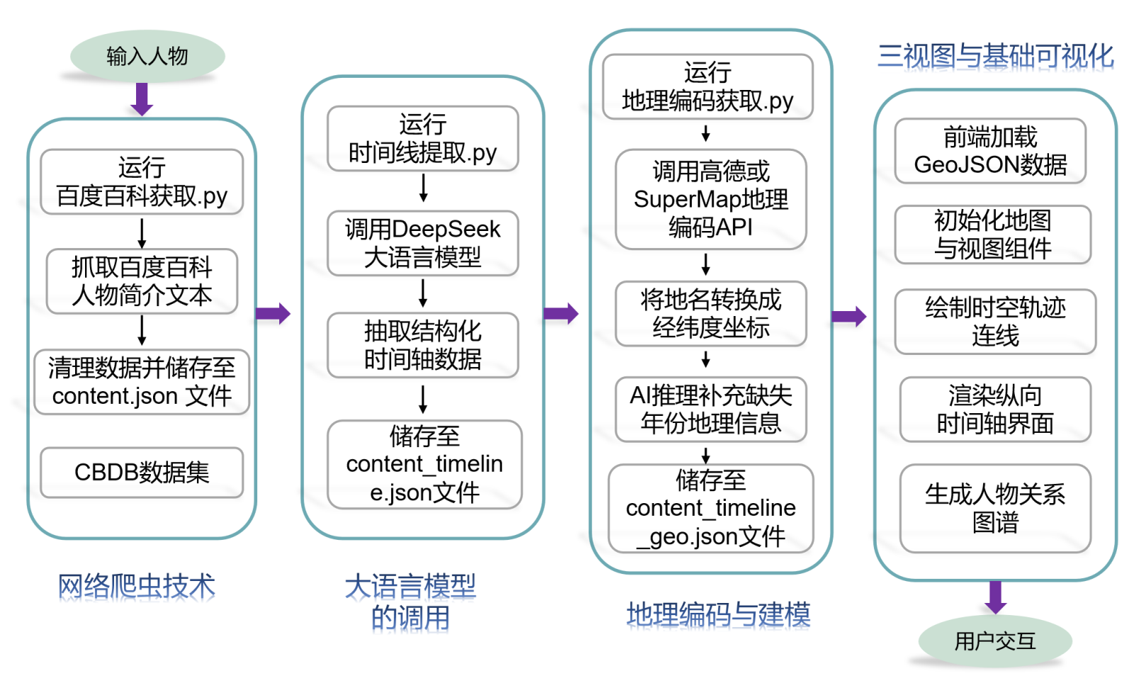 人物信息的生产从“输入人物”开始。系统先抓取人物简介等原始文本,并完成清洗与规整后;同时可引入CBDB数据作为权威补充与校核来源,解决百科文本缺漏与不一致问题。在此基础上,系统运行时间线提取代码,调用DeepSeek大语言模型对人物叙事进行事件切分与时间要素识别,抽取结构化时间轴条目。随后进行地理编码获取,调用SuperMap地理编码API将时间线中的地名转换为经纬度坐标;对缺失年份或地理信息不完整的条目,结合AI推理与本地缓存进行补全与修订,最终生成带时空属性的JSON文件。前端加载该GeoJSON数据后完成三视图与基础可视化:初始化地图与视图组件,绘制时空轨迹连线并渲染纵向时间轴界面,同时生成关系图谱;用户在地图点位、时间节点或图谱关系上的任意点击与筛选,都会触发其它视图同步定位与高亮,实现“时间、空间、关系”一致的叙事浏览与检索闭环。
