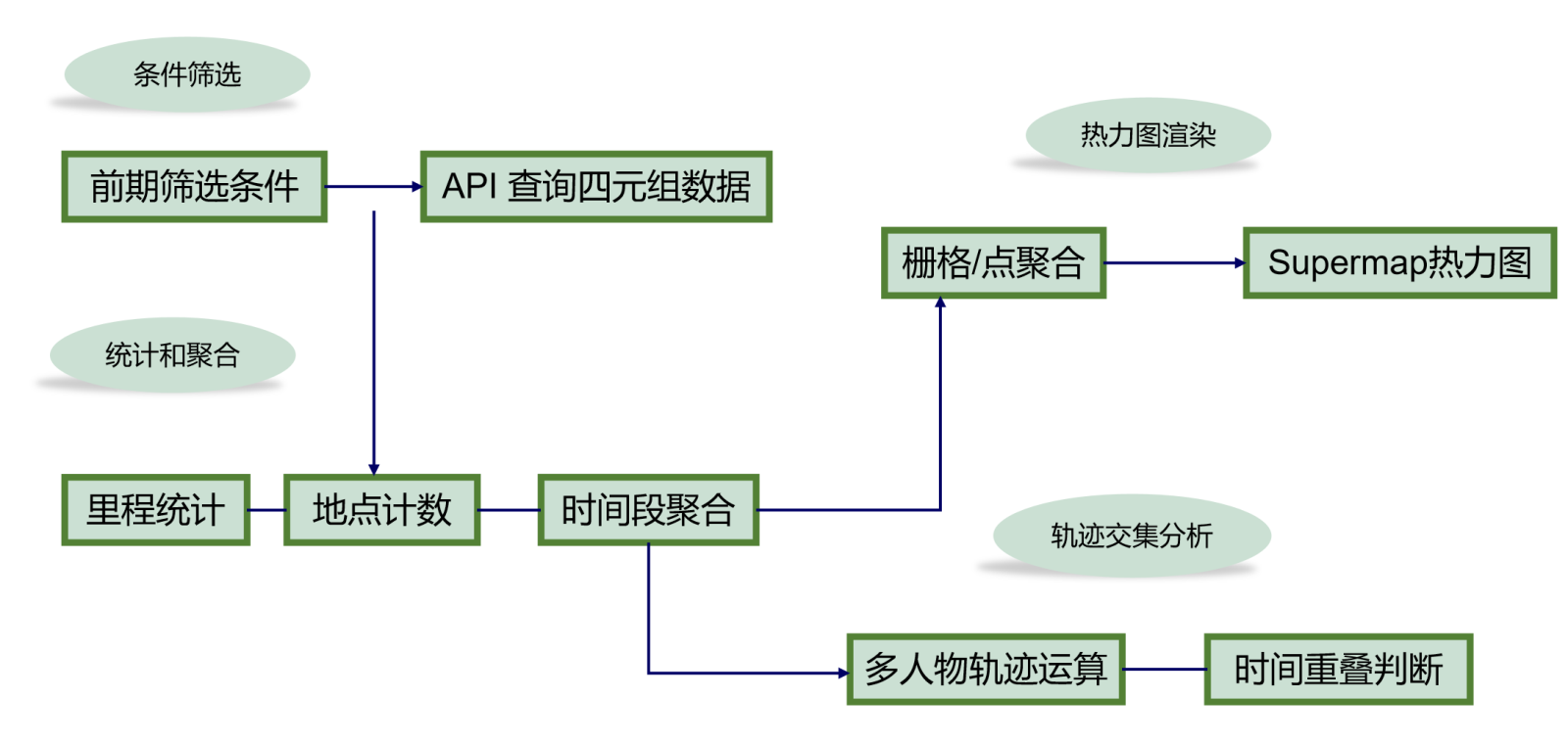 分析与统计以四元组作为统一输入,流程从“前期筛选条件”开始。用户设定人物、时间段等筛选条件后,前端通过API查询获得满足条件的四元组数据集合,作为后续计算的标准化数据源。在统计与聚合阶段,系统对结果进行多维汇总:一方面进行地点计数与里程统计,形成到访频次、行旅强度等基础指标;另一方面进行时间段聚合,将离散节点按年或阶段汇总为可比较的时间片统计。聚合完成后分为两条分析支路:其一为热力图渲染,系统对点集进行栅格化或点聚合后调用SuperMap热力图渲染能力生成热力图,直观表达热点与空间重心;其二为轨迹交集分析,系统进行多人物轨迹运算并加入时间重叠判断,识别同地点同时间窗的交汇关系,输出可解释的交集结果,用于支撑并行叙事与共时性发现。