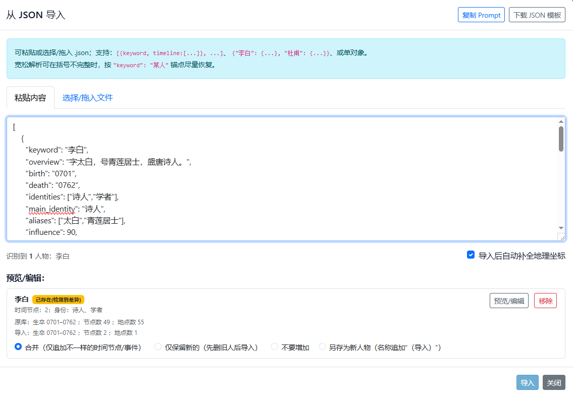 除自动采集外,系统也支持从 JSON 文件或文本模板直接导入人物数据;当检测到重复人物时,提供合并、仅保留新数据、另存为新人物或取消导入等处理策略。