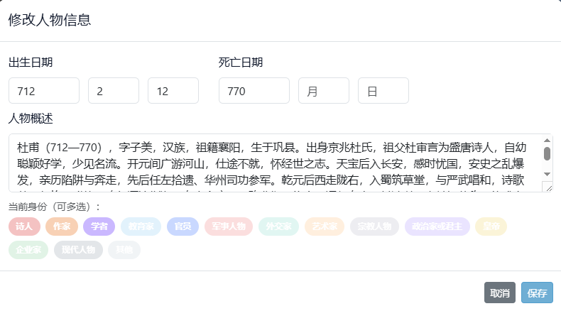 登录管理员账号后,系统支持人物的新增、删除与维护;输入人物名称即可触发后端流程,自动获取人物文本并提取时间轴数据,完成基础档案生成。