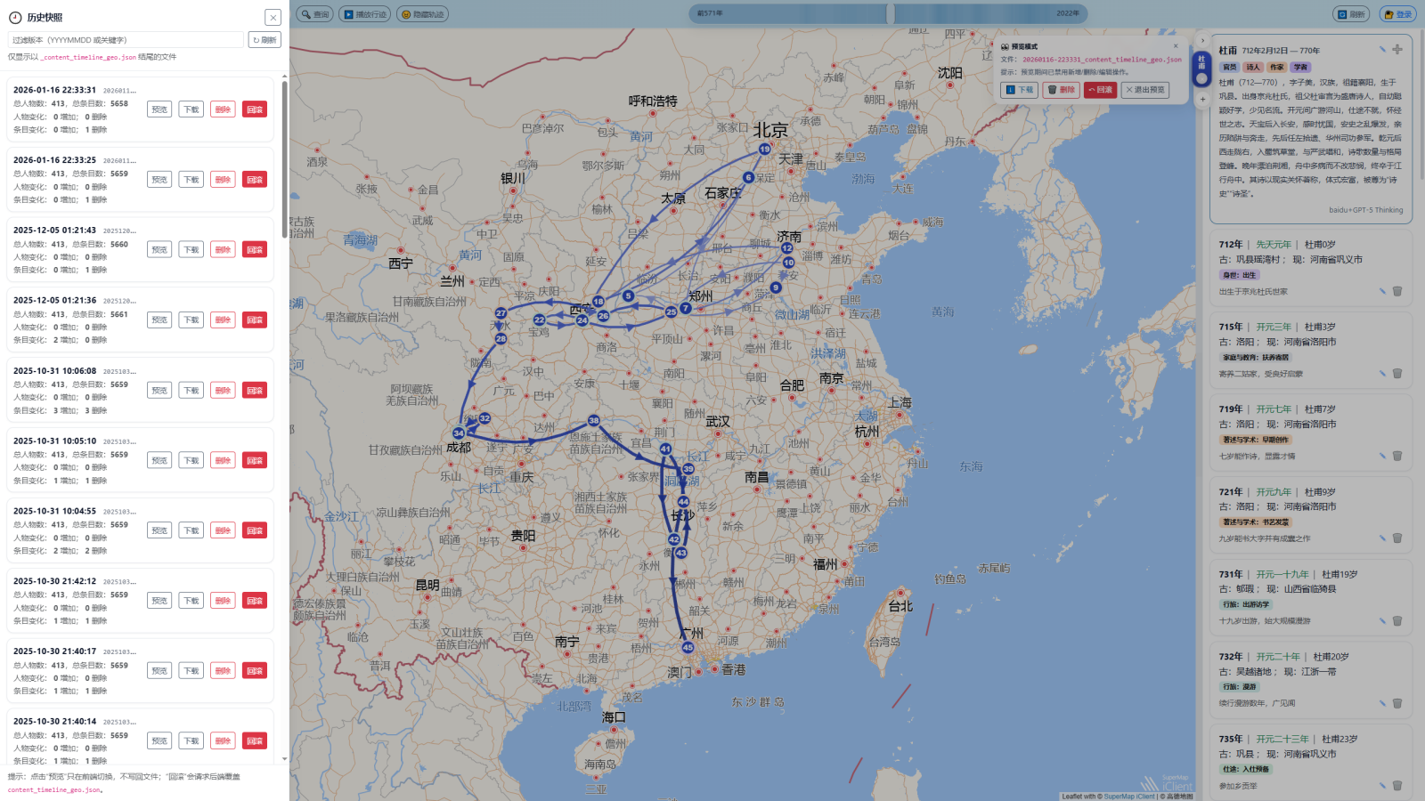 系统集成多源异构数据,以CBDB历史人物大数据库为基础,结合百科爬虫技术获取长尾人物资料,同时支持本地JSON导入与结构化编辑,实现400余位人物的轨迹还原与个性化补充。在地名处理方面,系统调用超图与高德地理编码API,实现地名标准化与坐标落地,为轨迹绘制与空间分析奠定数据基础。